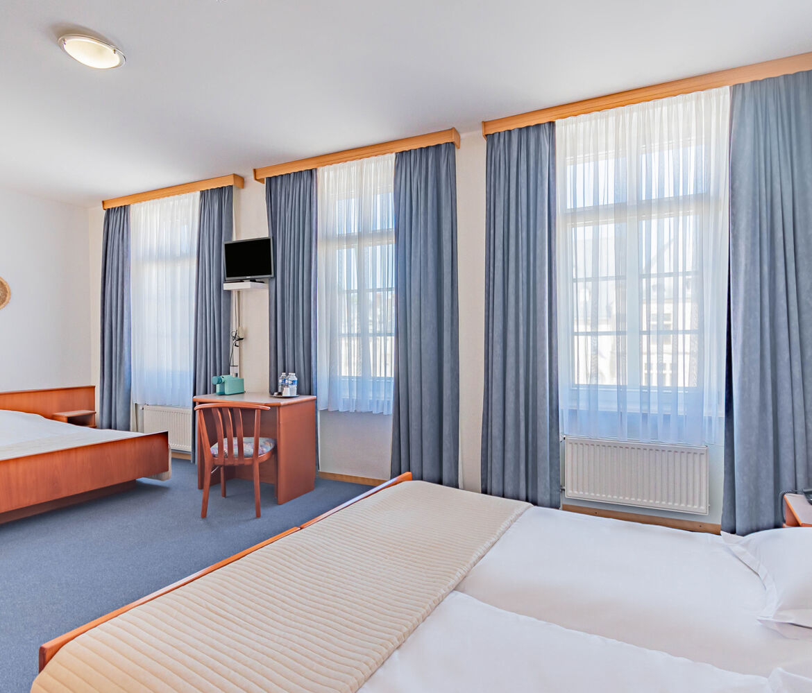 Die Zimmer sind modern. Viele bieten den Blick auf den Marktplatz sowie auf eines der geschichtsträchtigsten Gebäude der ältesten Stadt Luxemburgs, den Denzelt.