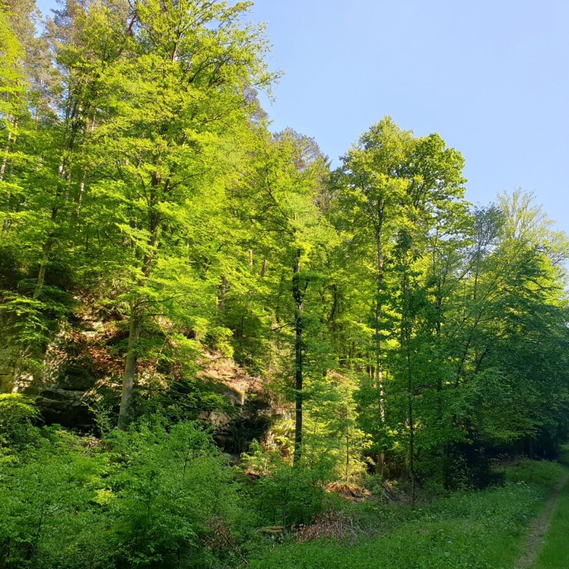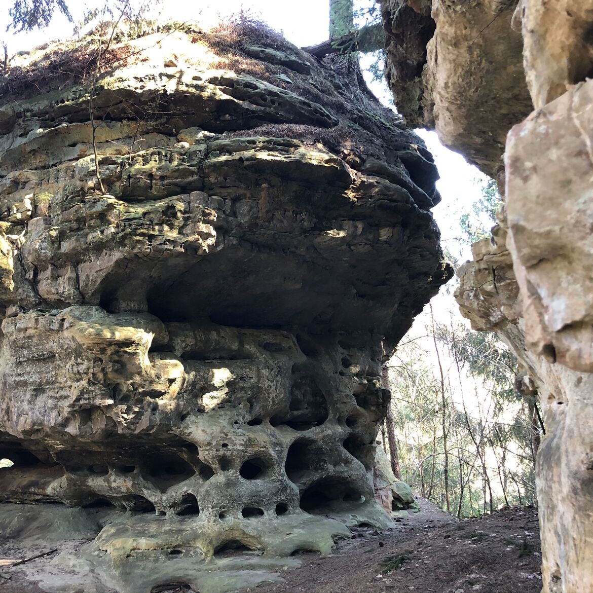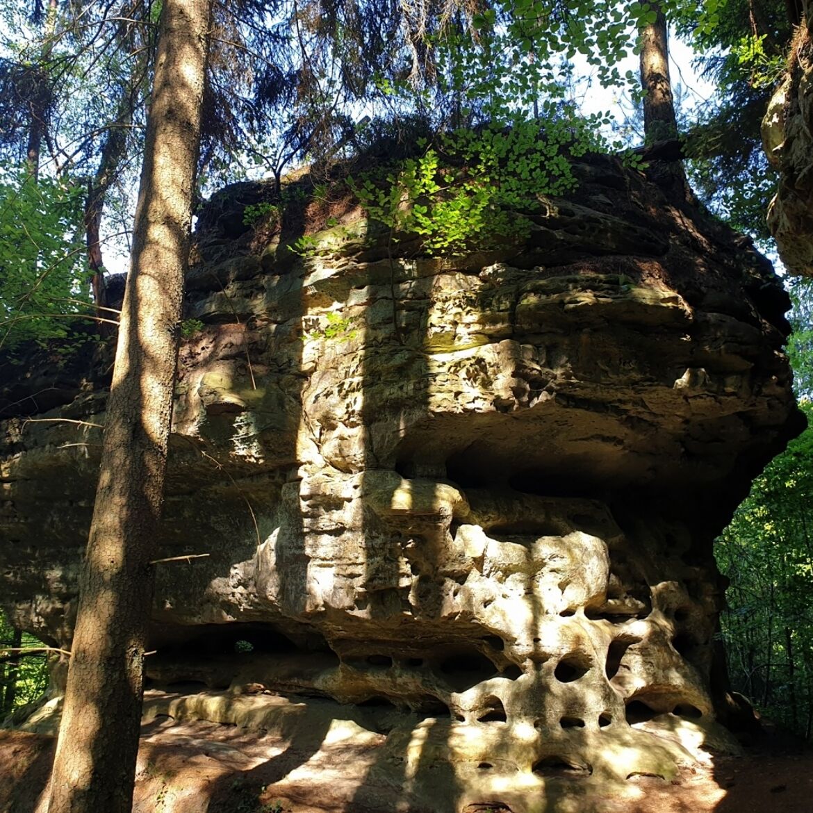 The path leads gently up the mountain between rocks to the highest point of the region. Once at the top, it runs for a while over a wooded hill before descending to the Napoleonshutt, a distinctive solitary rock formation that resembles a head covering.