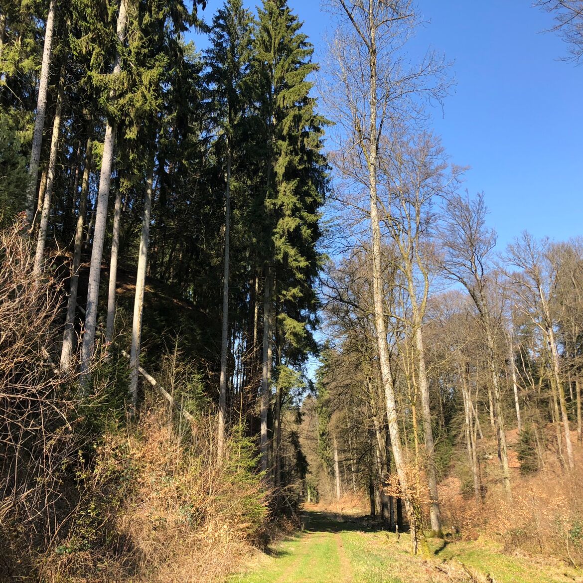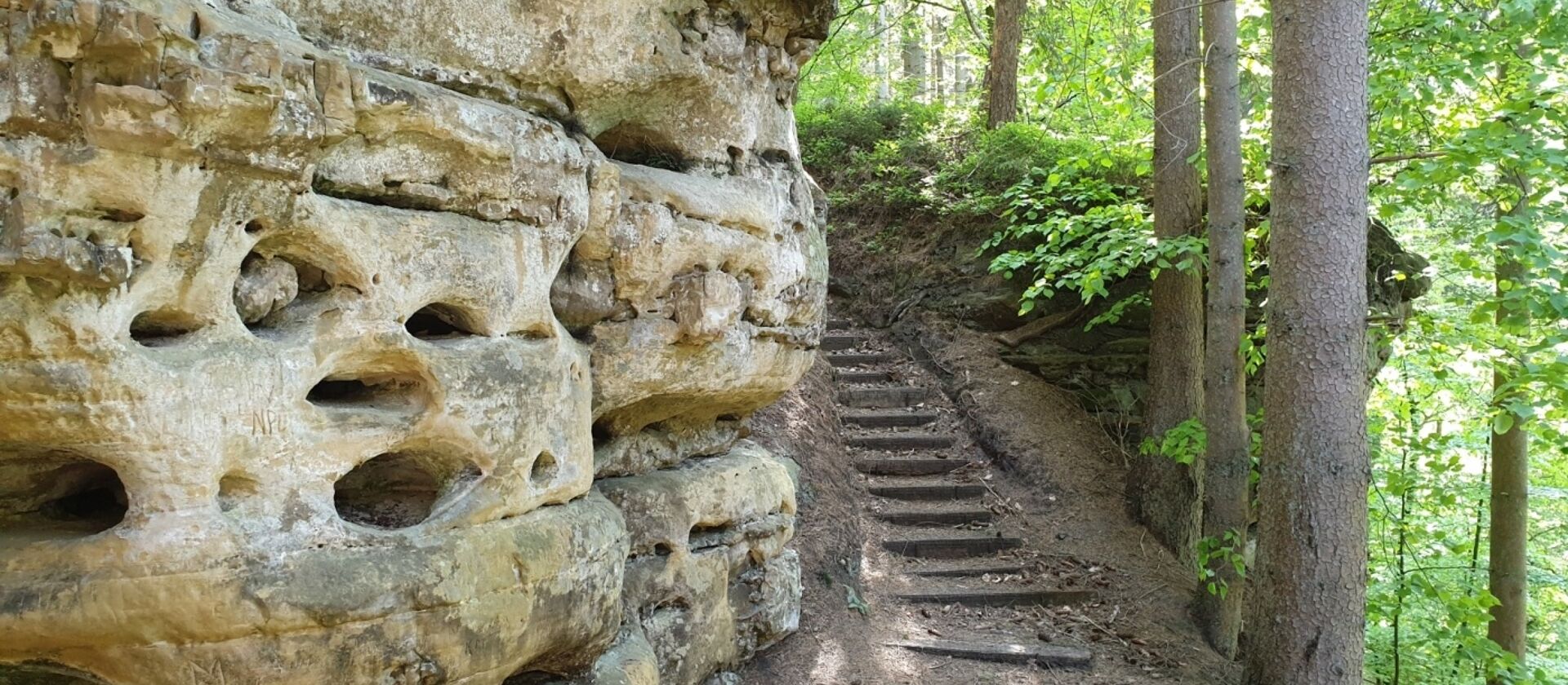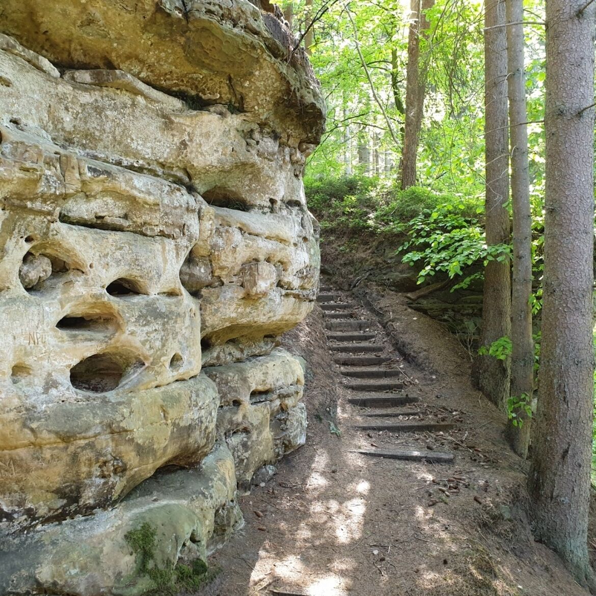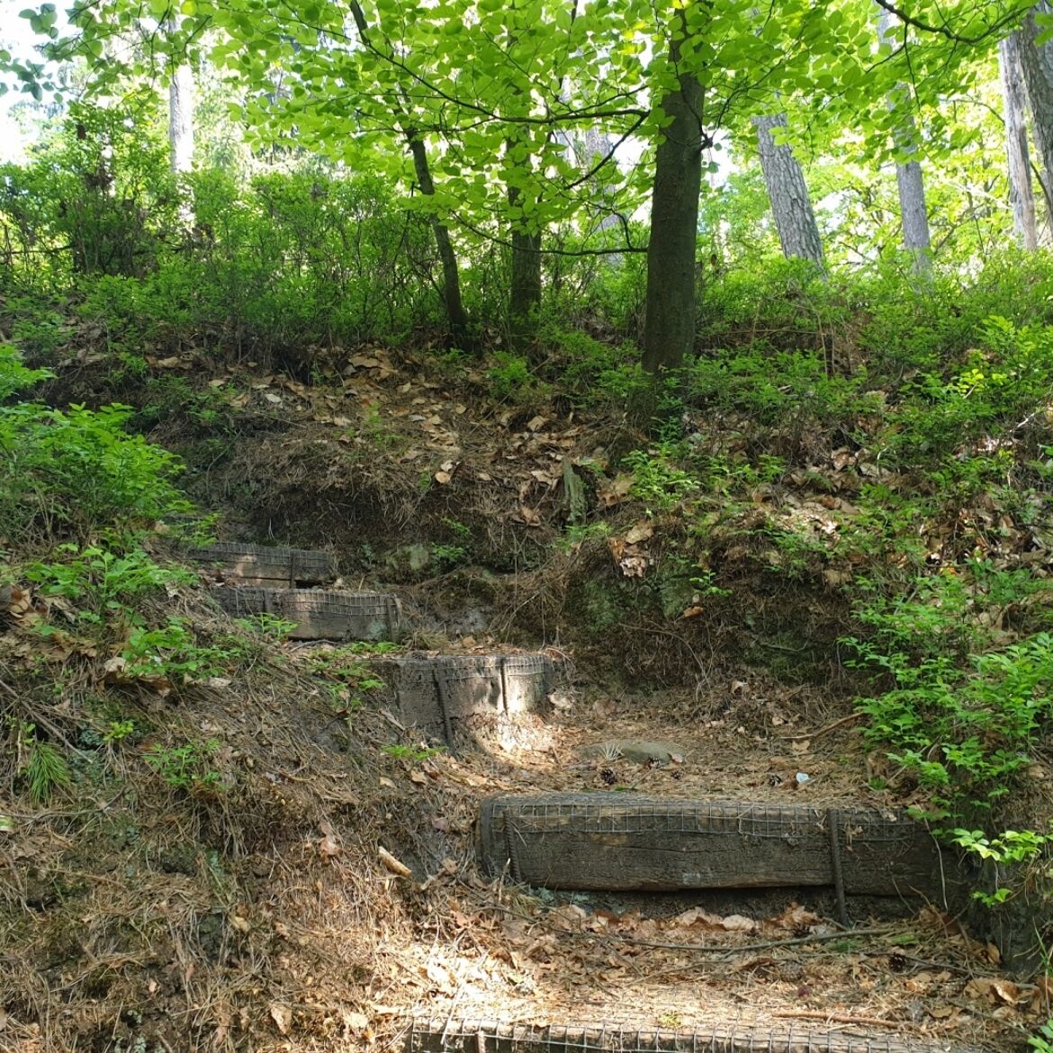 The path leads gently up the mountain between rocks to the highest point of the region. Once at the top, it runs for a while over a wooded hill before descending to the Napoleonshutt, a distinctive solitary rock formation that resembles a head covering.