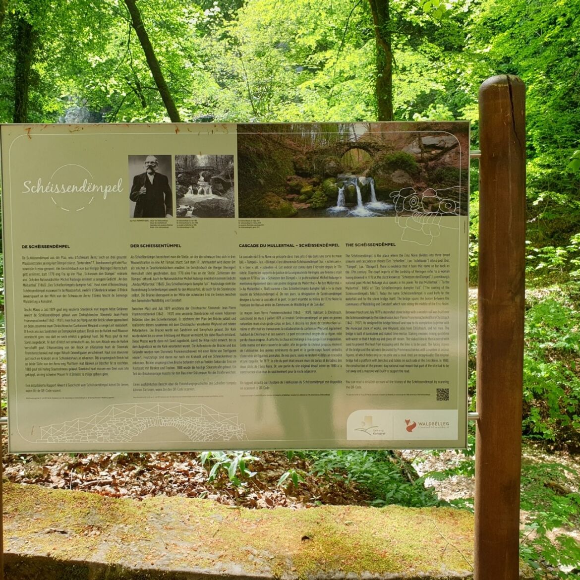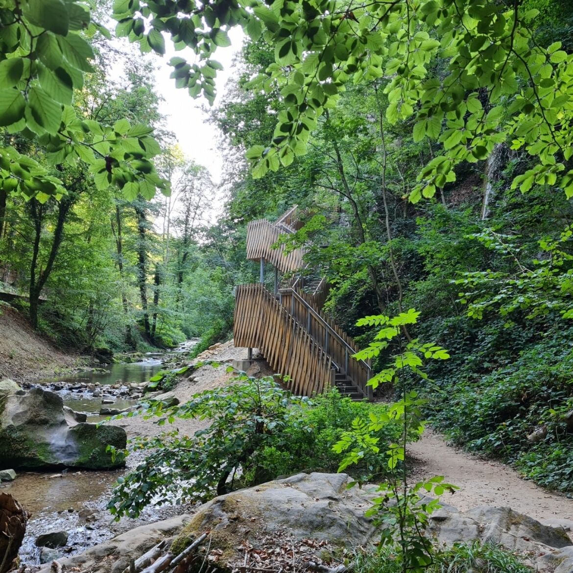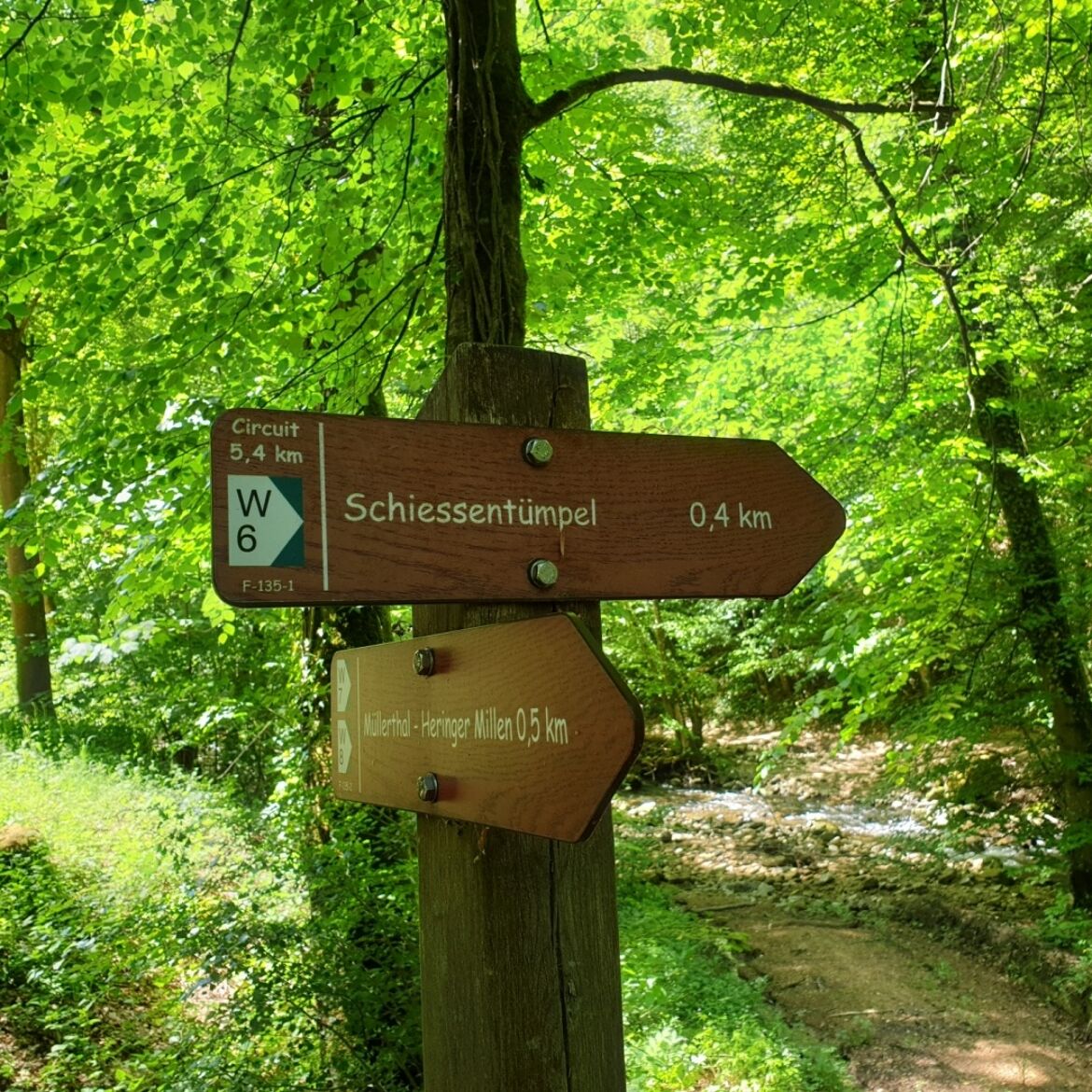 This hiking trail leads to the landmark of the Mullerthal region - Little Luxembourg Switzerland: the Schiessentümpel. It is the most popular excursion destination in the region and can best be reached on foot. Behind the Schiessentümpel is a modern staircase structure built to make the Schiessentümpel accessible again after the heavy storms in 2018.