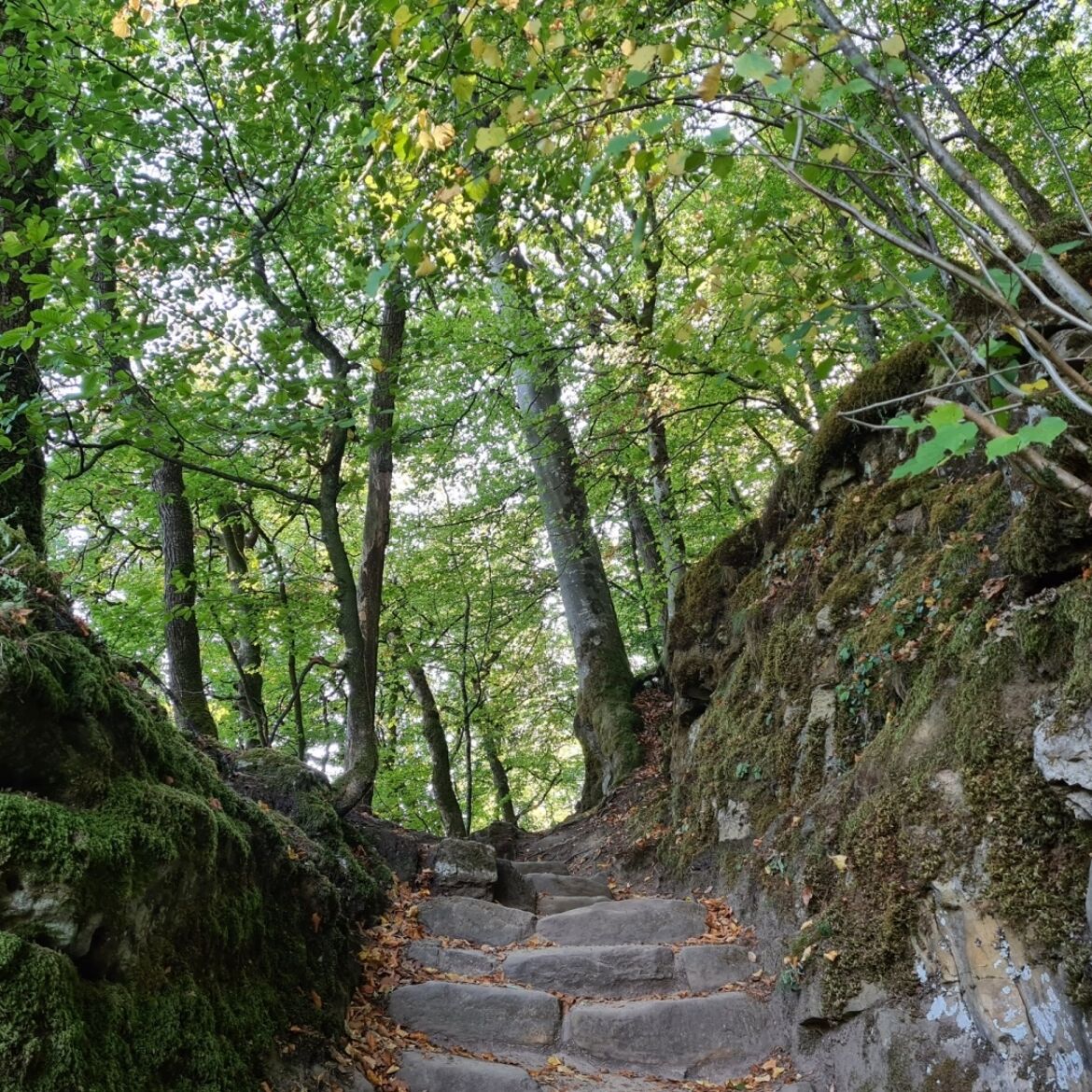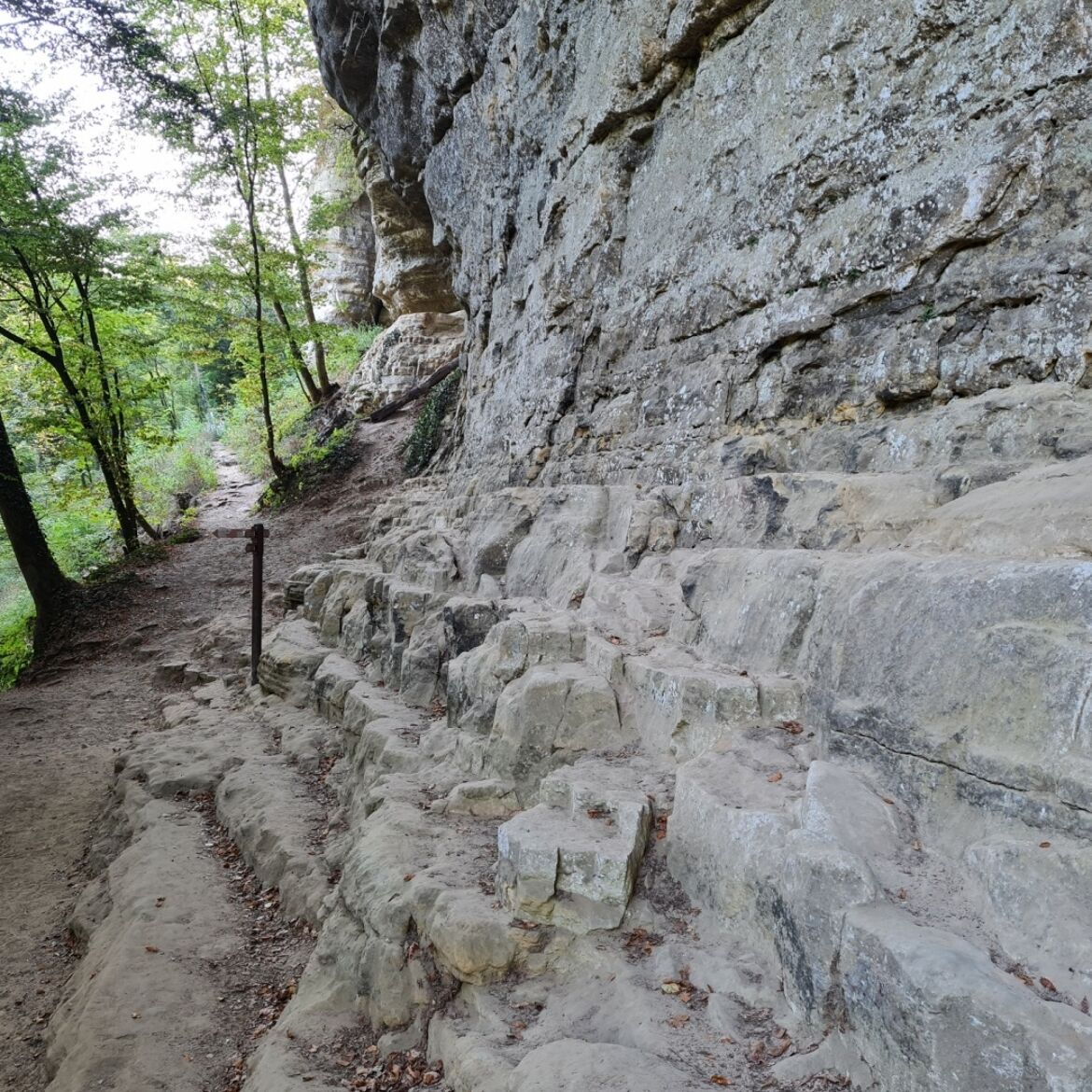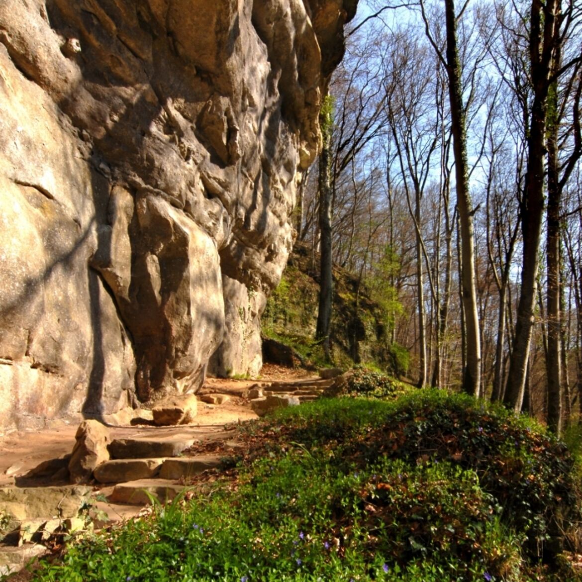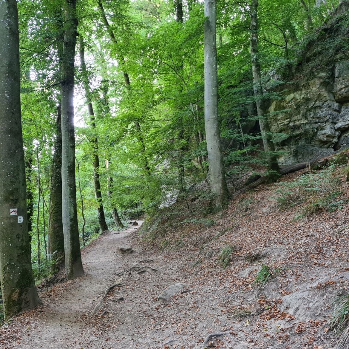 This hiking trail leads to the landmark of the Mullerthal region - Little Luxembourg Switzerland: the Schiessentümpel. It is the most popular excursion destination in the region and can best be reached on foot. Behind the Schiessentümpel is a modern staircase structure built to make the Schiessentümpel accessible again after the heavy storms in 2018.
