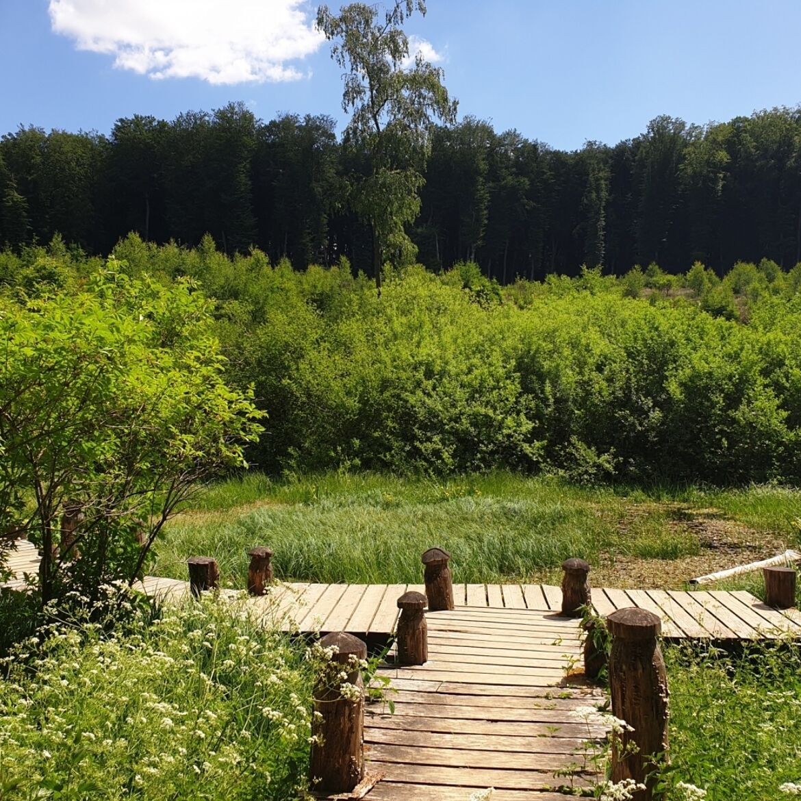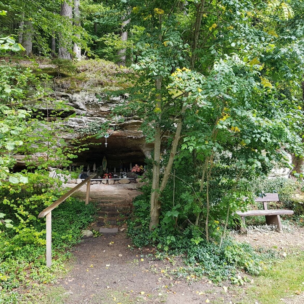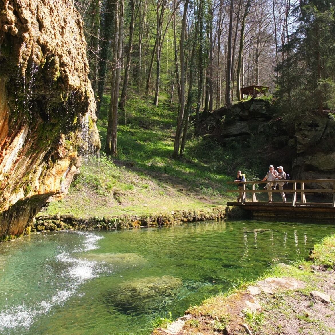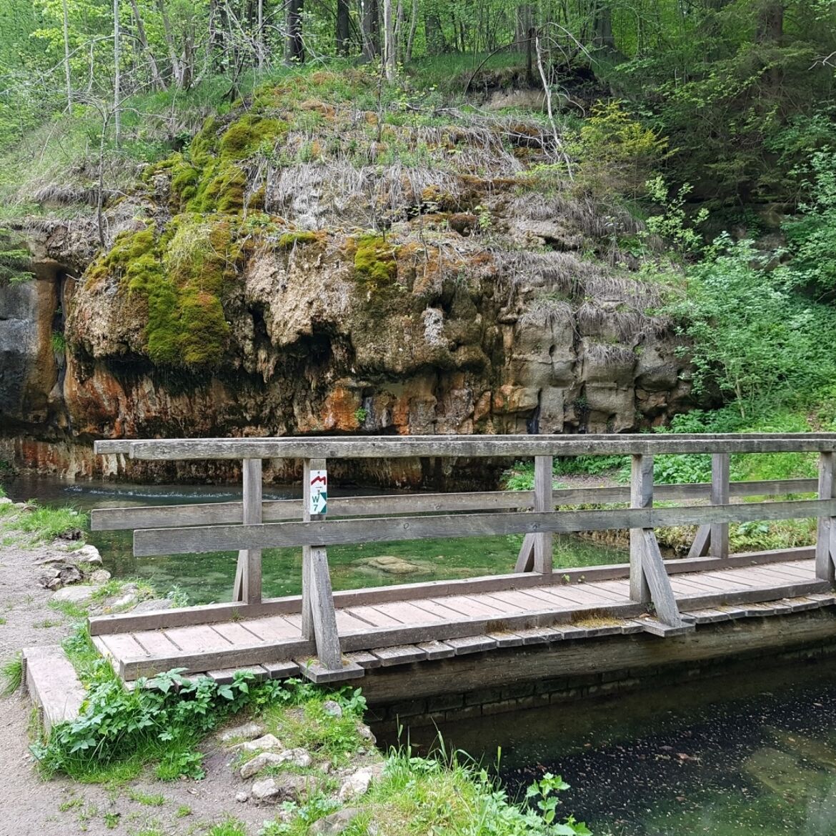 From Blumenthal, the path goes through the Marscherwald, a light beech forest, as well as along the Schwarze Ernz. Over a wooden footbridge, the hiker reaches the impressive Kallektuff spring (calcareous tufa spring).