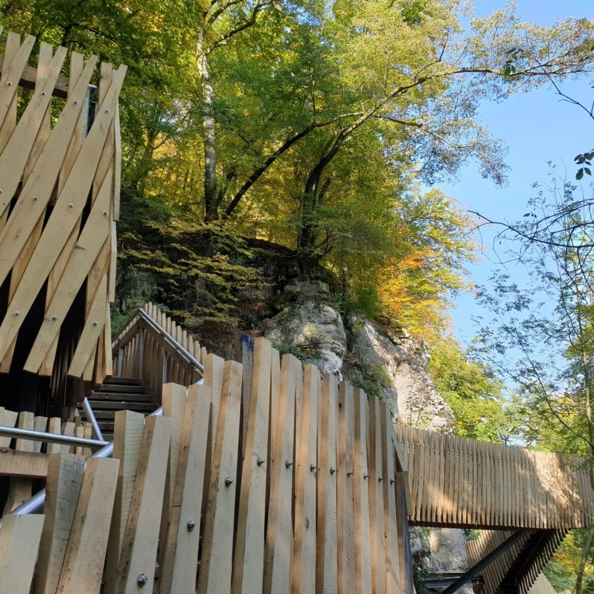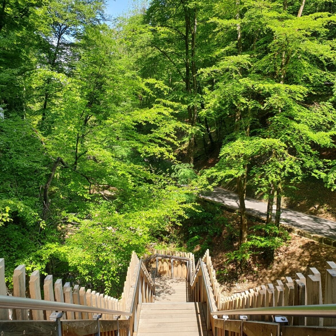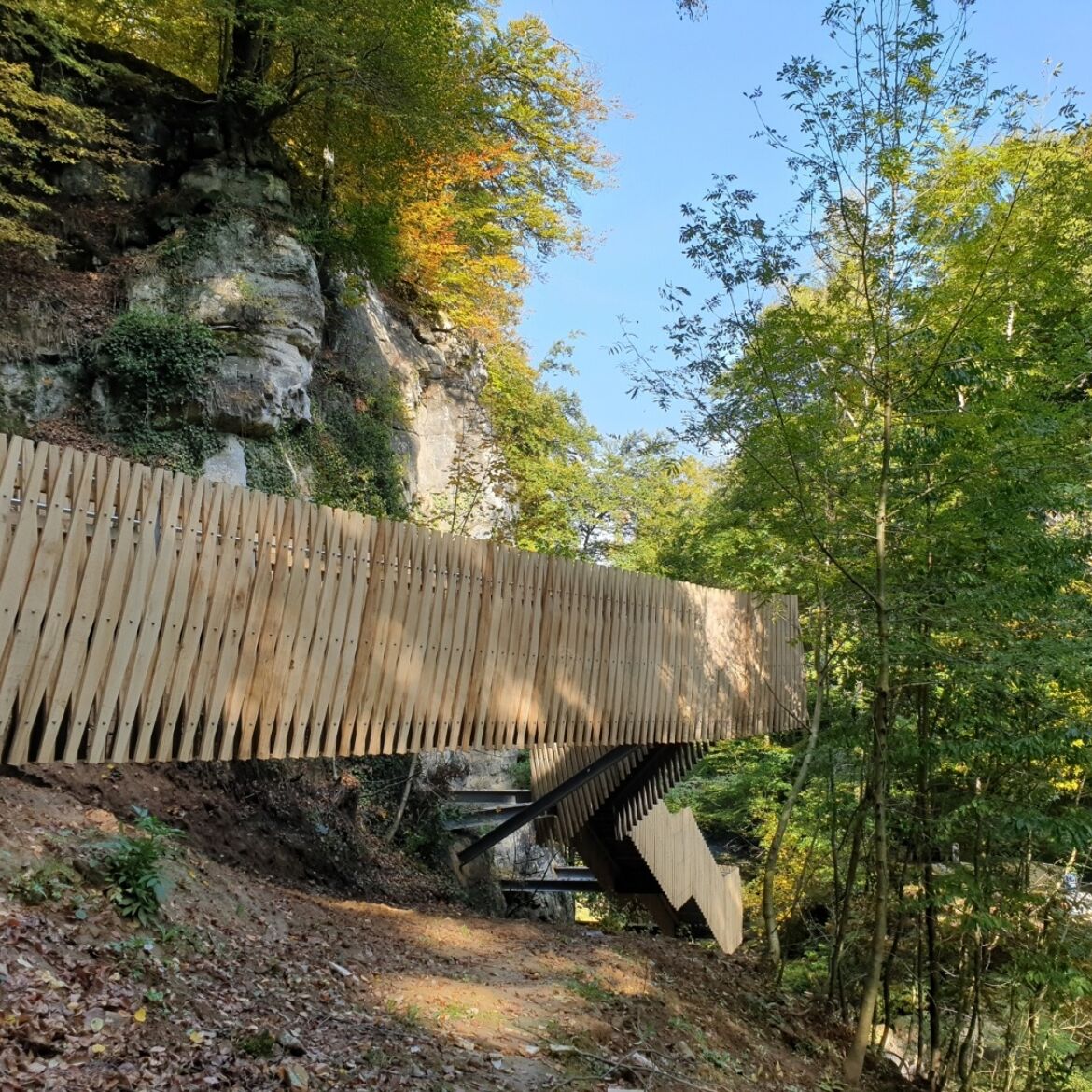 On the route, there are two castles, each with its own character: the castle ruins in Larochette and Beaufort, along with the associated Renaissance castle. Besides the castles, the route runs along protected stream valleys, through forests, along rocks, and to spectacular viewpoints. Over a 700m long wooden footbridge, you reach the Kallektuff spring, a moss-covered rock from which water emerges and collects in a basin - here you can experience a colorful spectacle at any time of the year. Route 3 also passes the symbol of Luxembourg tourism: the Schéissendëmpel - a waterfall with a small, romantic bridge.