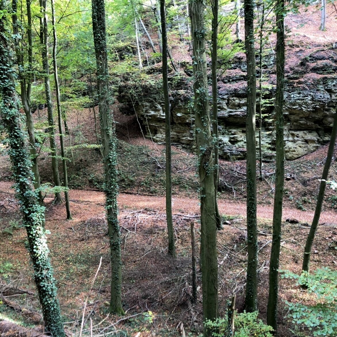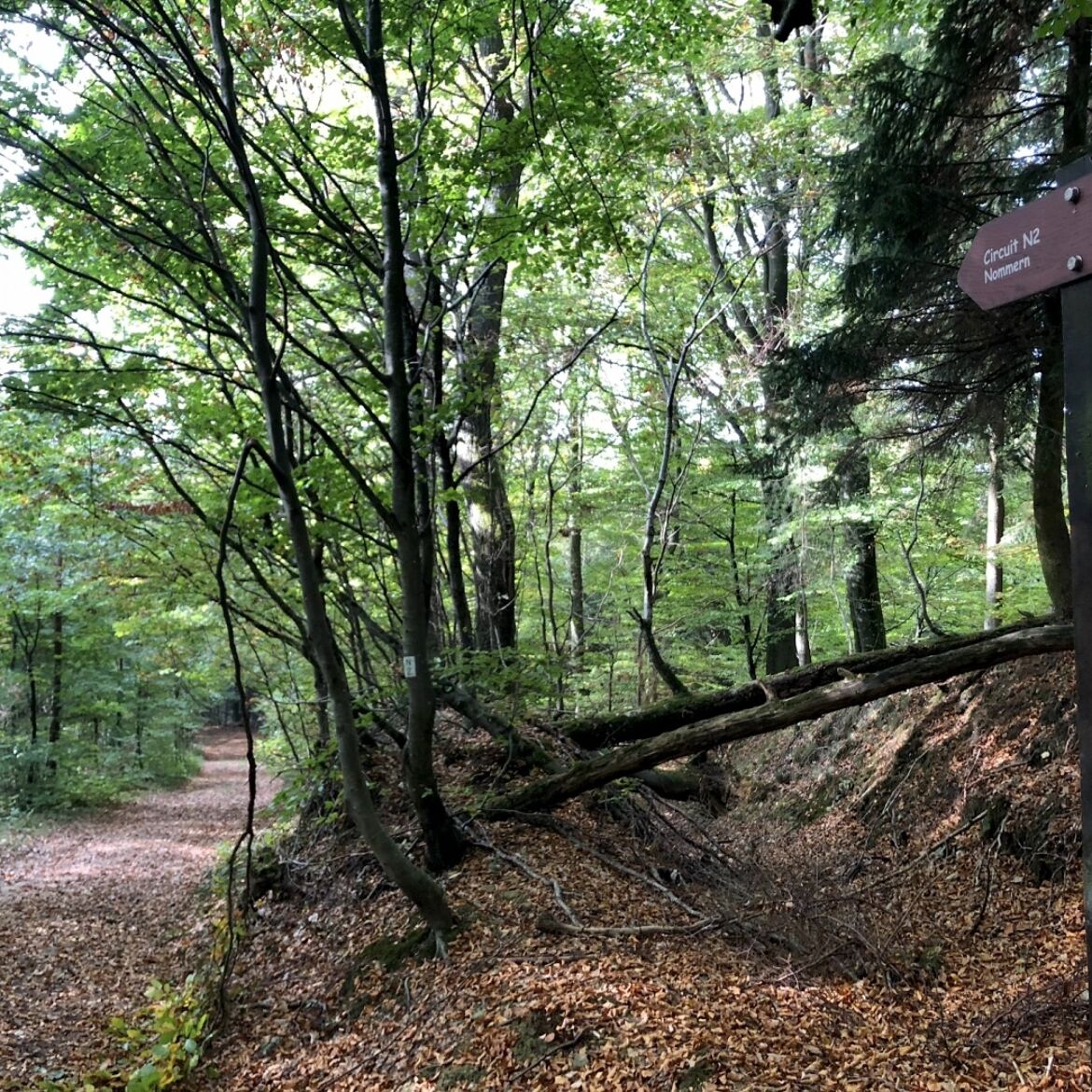 The hiking route initially leads from the starting point to the right towards Camping Nommerlayen. Before the campsite, the path leads left uphill. After about 300 meters, turn left where a longer ascent awaits. After crossing the road to Larochette, you reach the highest point of the hiking route. Afterwards, it goes downhill again on a forest path back to the starting point. Part of the hike follows the route of the former Jhangli narrow-gauge railway, which was used from 1882-1948.