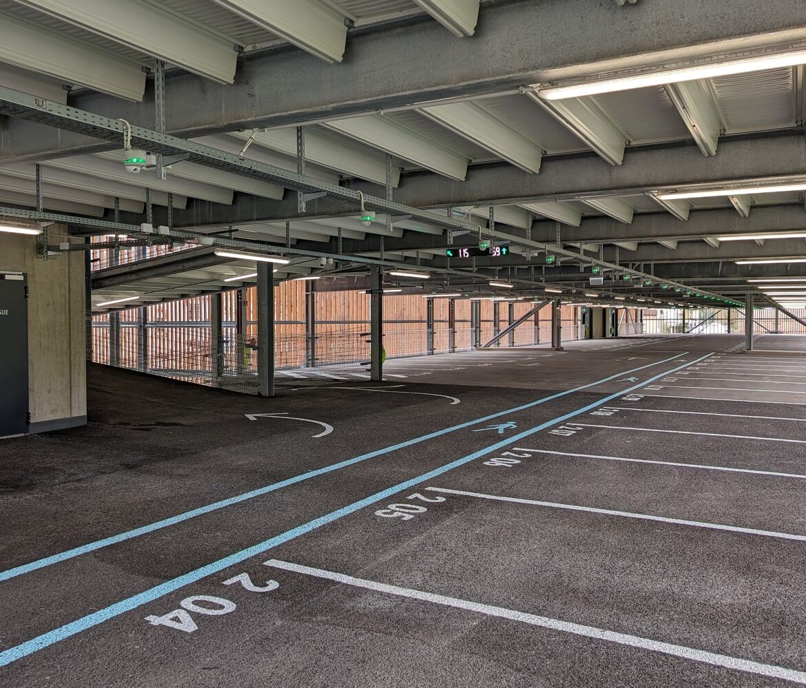 Le parking "Campus Gare" se distingue par son équipement moderne et sa fonctionnalité polyvalente, qui répondent pleinement aux exigences des utilisateurs. Avec un total de 235 places de stationnement, il offre une capacité généreuse pour tous les types de véhicules. Ce nombre important de places de stationnement garantit non seulement un espace suffisant pour les véhicules des étudiants, des employés et des visiteurs du campus, mais contribue également à désengorger le stationnement dans les environs.