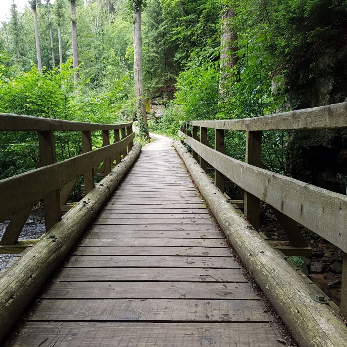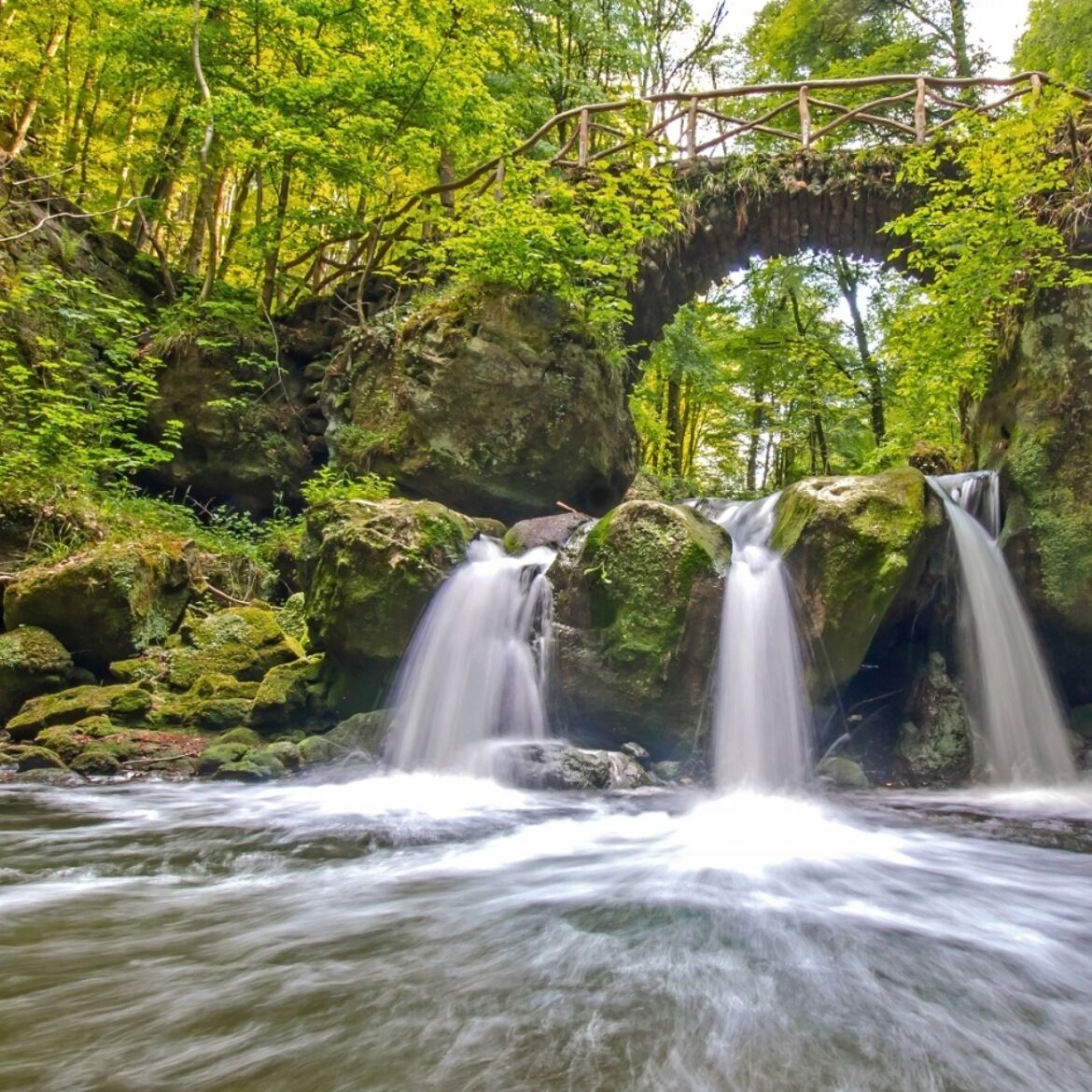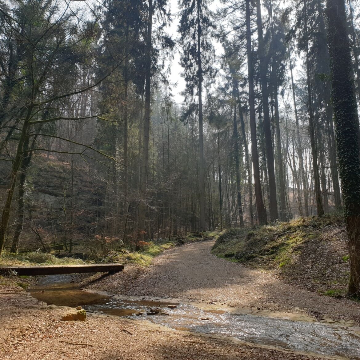 Un passage en bois vous conduit à la spectaculaire source de tuf calcaire, où un cours d'eau coule doucement sur une avancée rocheuse dans un étang clair comme du cristal. Le point d'orgue est l'emblème de la région de Müllerthal – Petite Suisse luxembourgeoise – le Schiessentümpel avec son pont de pierre pittoresque au-dessus de la petite cascade.