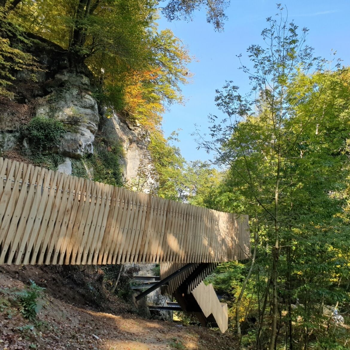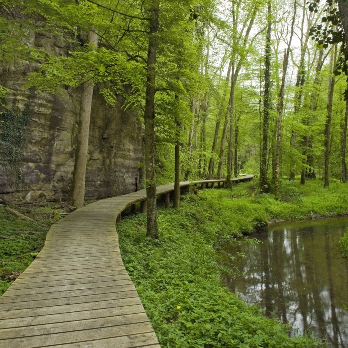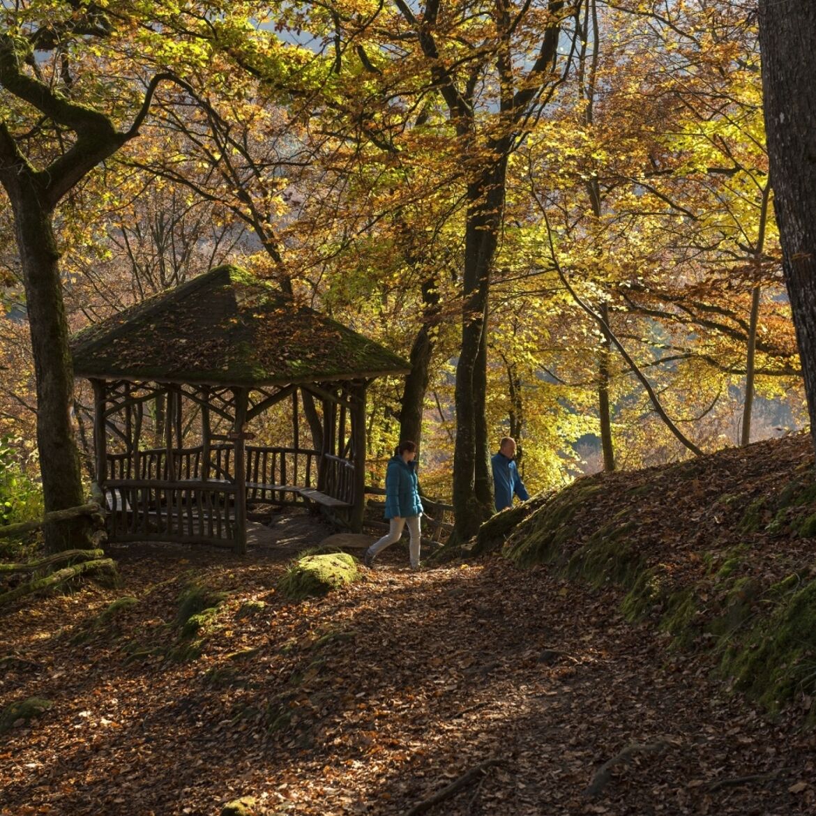Un passage en bois vous conduit à la spectaculaire source de tuf calcaire, où un cours d'eau coule doucement sur une avancée rocheuse dans un étang clair comme du cristal. Le point d'orgue est l'emblème de la région de Müllerthal – Petite Suisse luxembourgeoise – le Schiessentümpel avec son pont de pierre pittoresque au-dessus de la petite cascade.