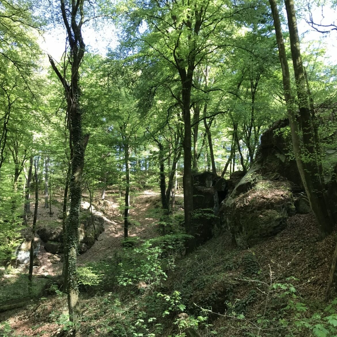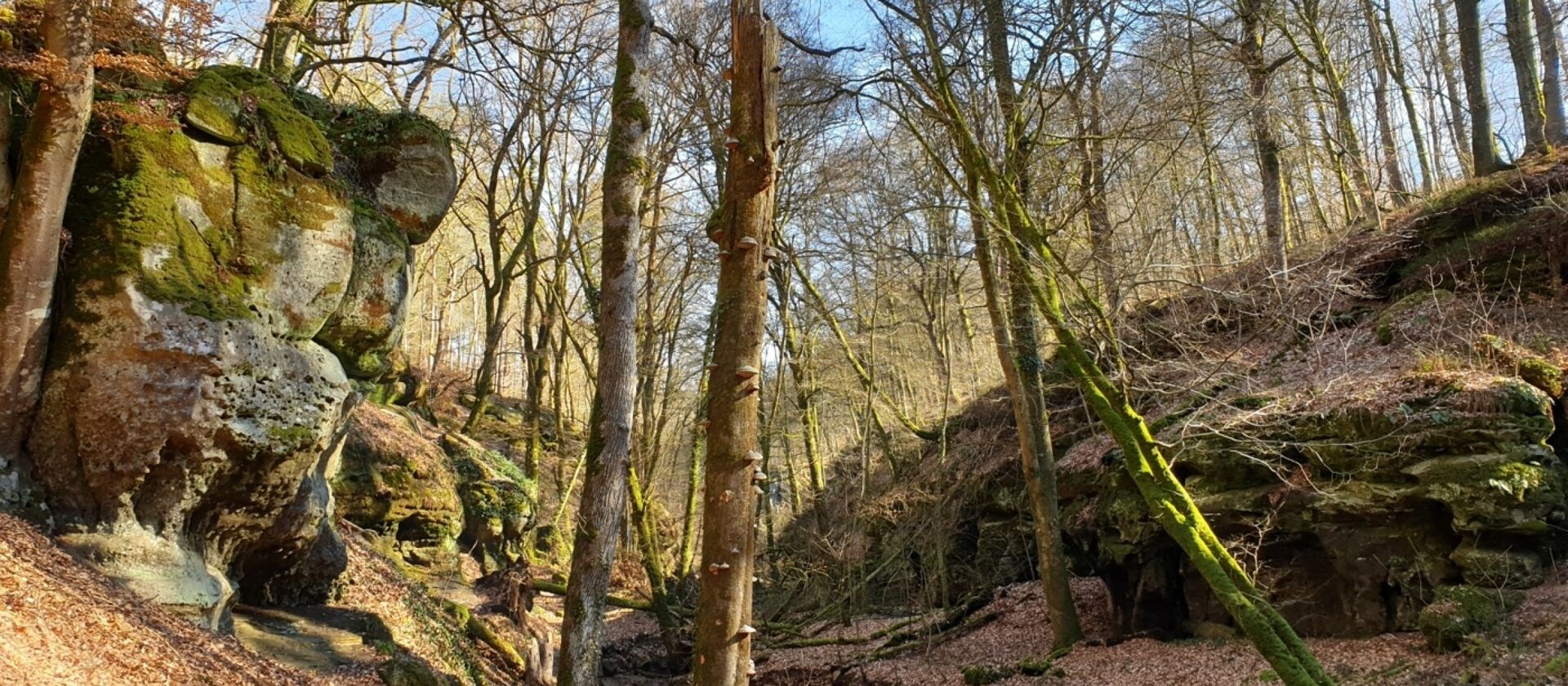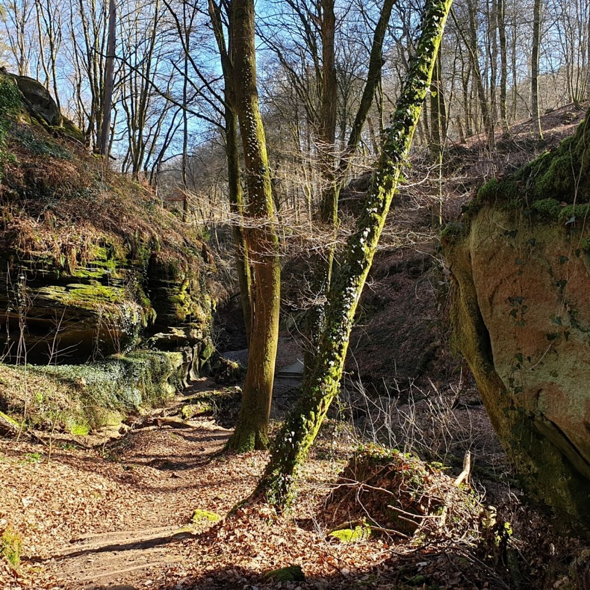 Het pad loopt eerst langs de beek en dan door het rotslandschap van Berdorf. De Huel Lee is alleen te bereiken via een omweg (ca. 150 m lang) naar links na ca. 800 m. De Huel Lee is een door mensen gemaakte grot. Daar werden vroeger molenstenen uit de rotsen gebroken.
