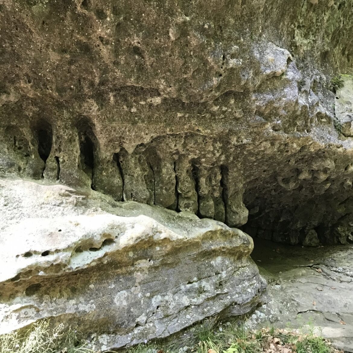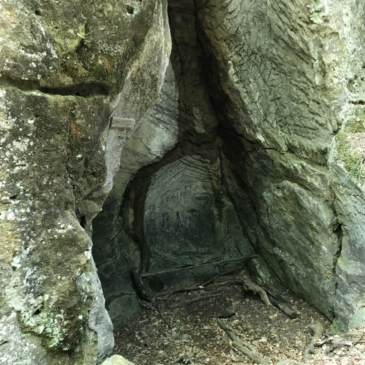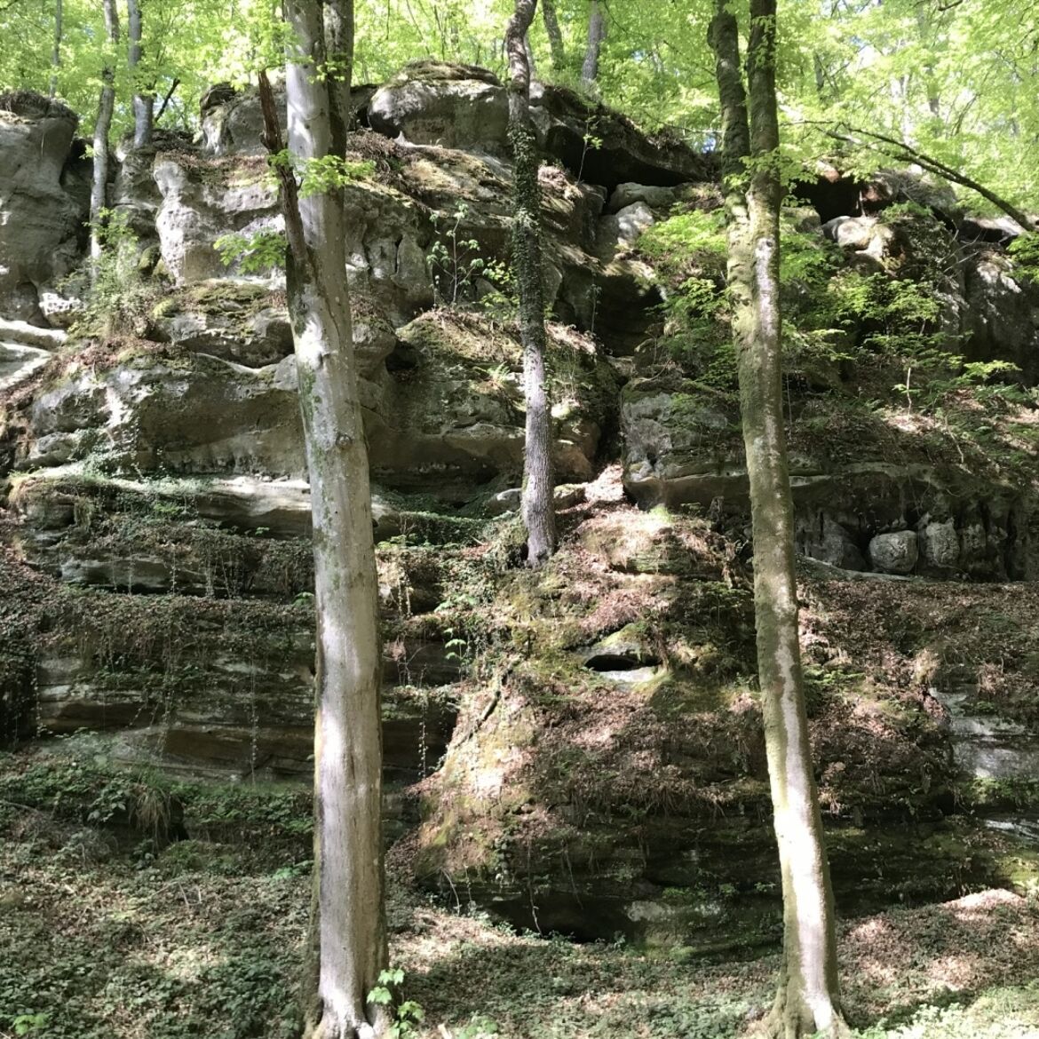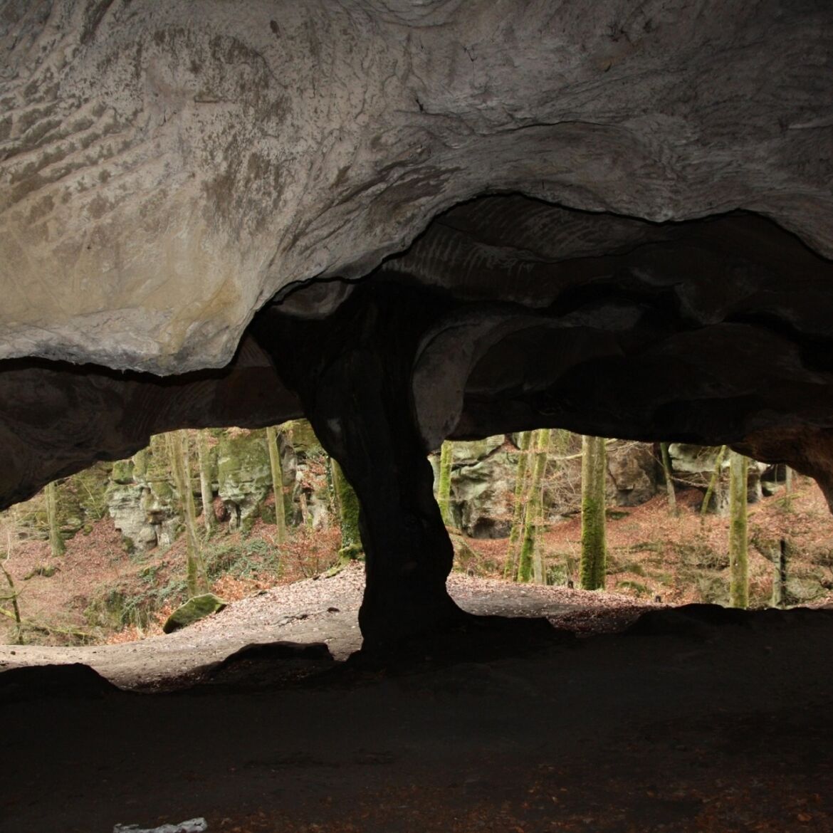 Het pad loopt eerst langs de beek en dan door het rotslandschap van Berdorf. De Huel Lee is alleen te bereiken via een omweg (ca. 150 m lang) naar links na ca. 800 m. De Huel Lee is een door mensen gemaakte grot. Daar werden vroeger molenstenen uit de rotsen gebroken.