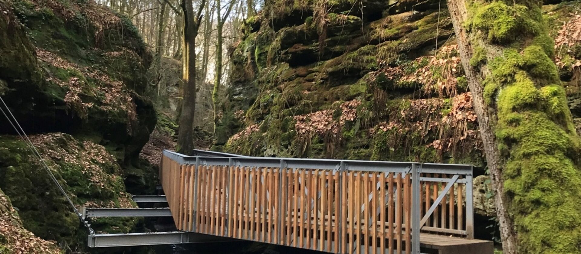 De route verbindt de oudste stad van Luxemburg met twee van de meest indrukwekkende geologische hoogtepunten van de regio: de Wollefsschlucht bij Echternach en de Huel Lee in Berdorf.