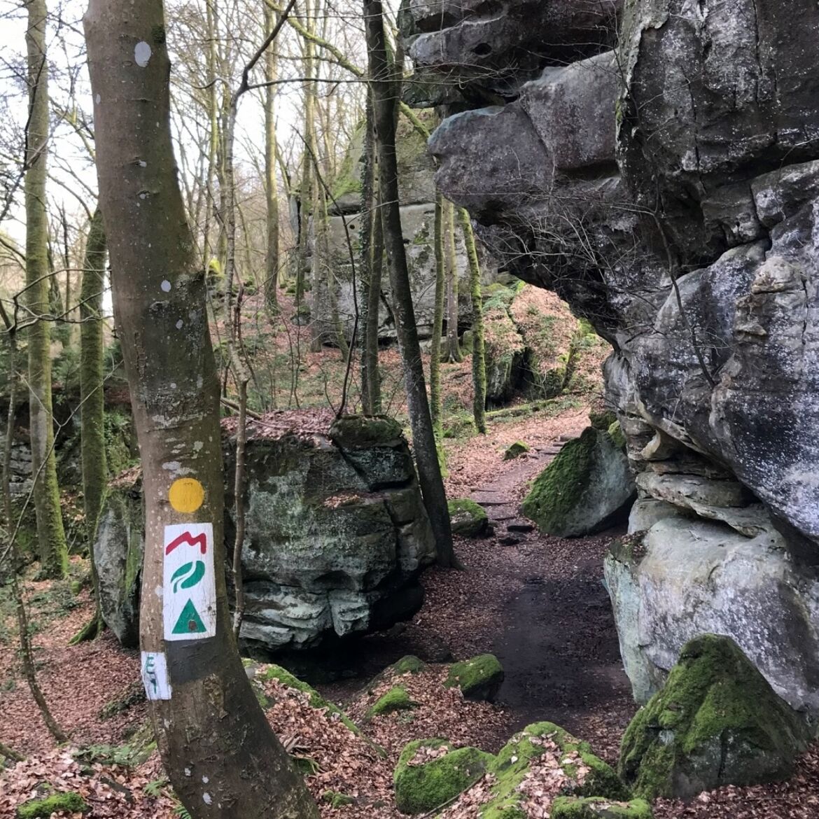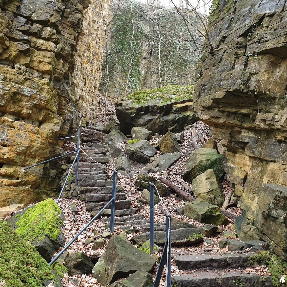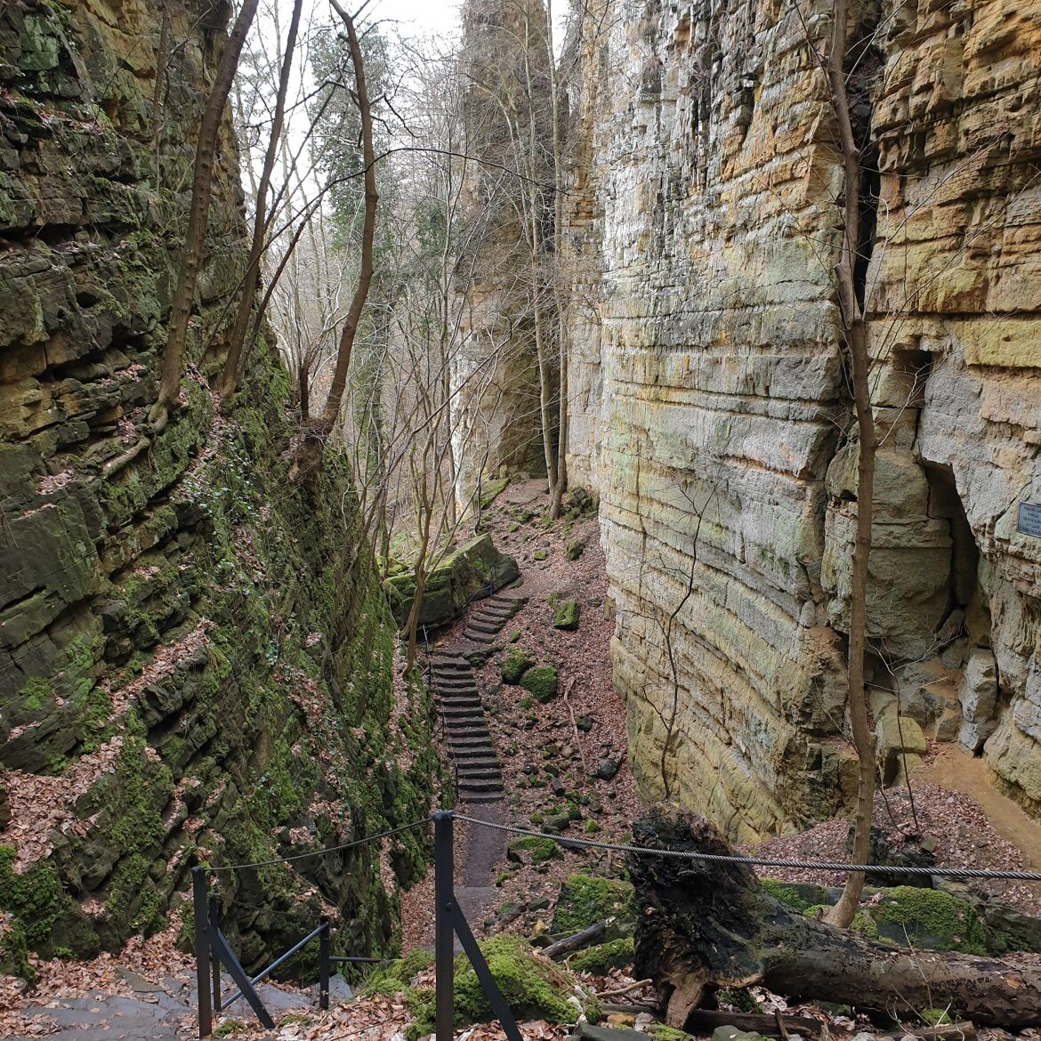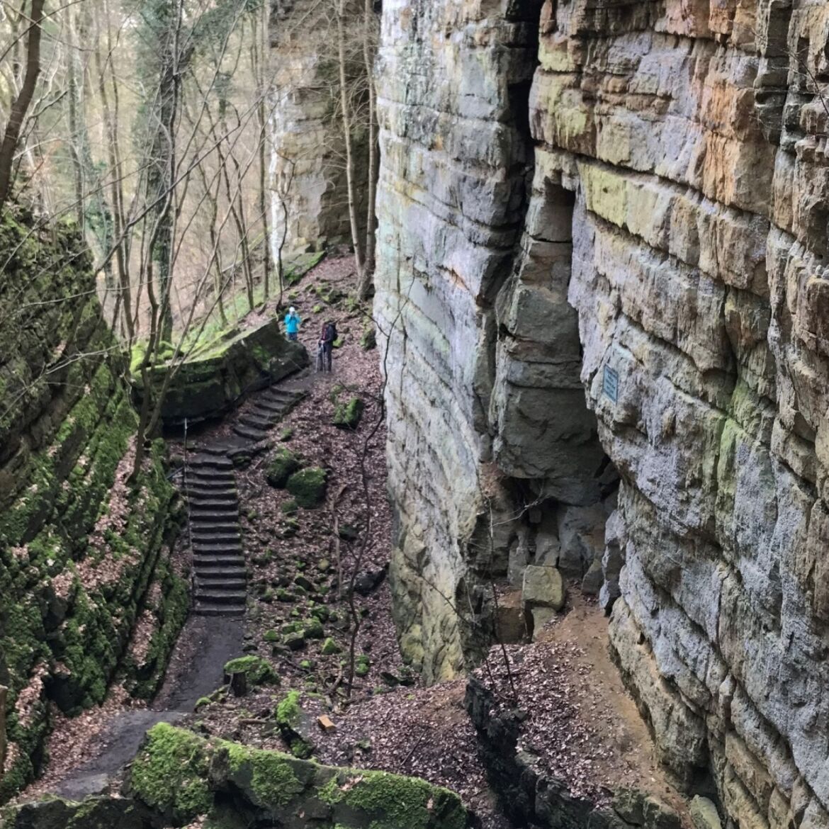De Wolfsschlucht is een steile, gladde spleet waar het pad doorheen slingert.