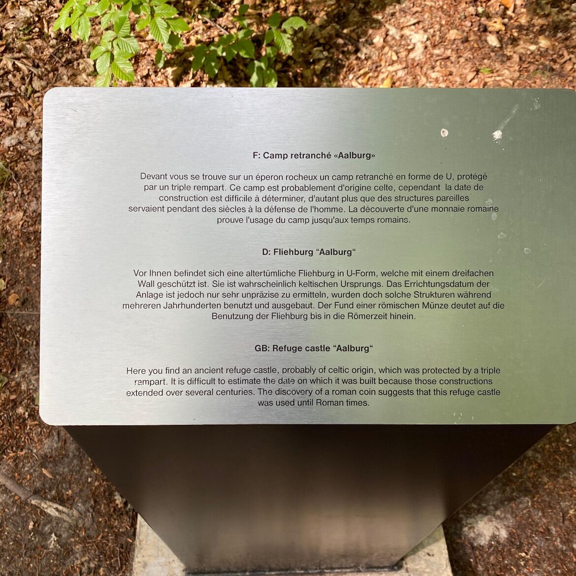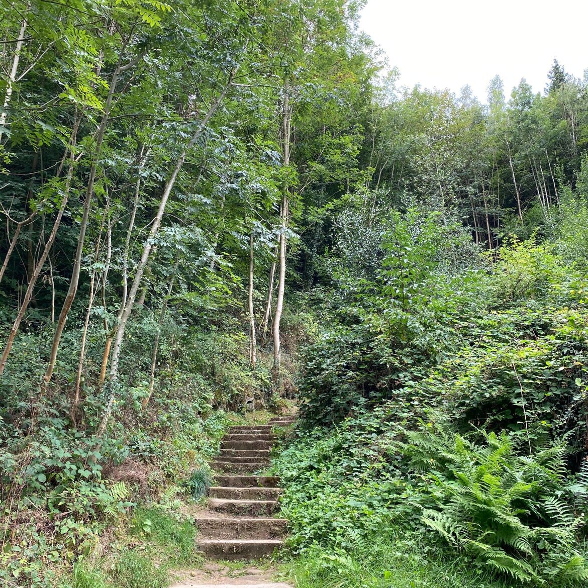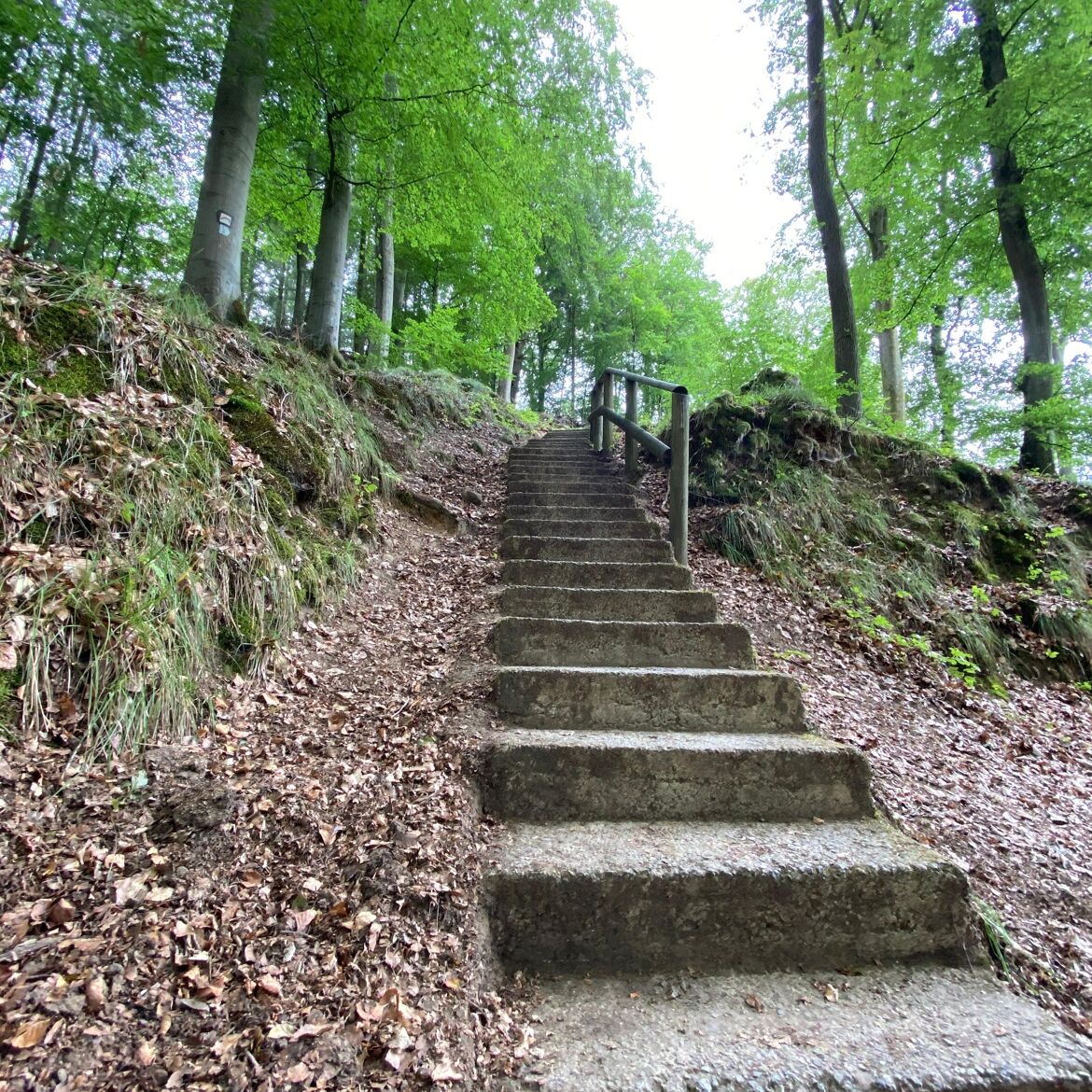 Vanaf het begin bij de Tourist Info leidt het pad naar de Gudelterhaff en verder naar de Noumerleeën. Deze indrukwekkende rotsformaties zijn kenmerkend van de Luxemburgse zandsteen uit de regio en tonen veel verschillende geologische structuren. De overblijfselen van een vluchtburcht, de Alebuerg, zijn hier te vinden, evenals sporen van houtverkolingsplekken. Vervolgens gaat het pad door het bos, de Knappbësch, langs een kapel naar de Heisgeskräiz, waarschijnlijk het oudste wegkruis in Luxemburg. Niet ver van het kasteel gaat de weg terug naar het startpunt.